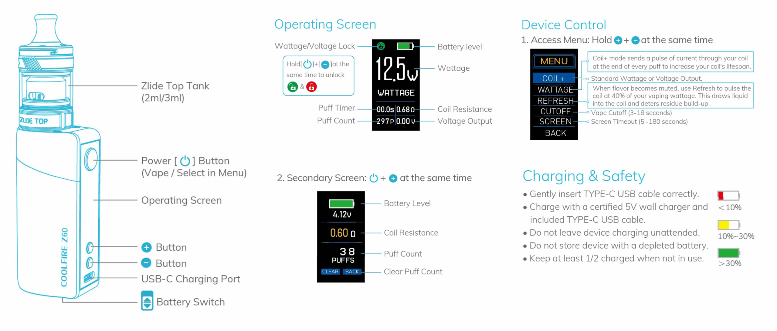 La box CoolFire Z60 est équipé d’une batterie intégrée de 2500 mAh, rechargeable via un USB-C et capable de fournir jusqu’à 60 watts de puissance et d’opter pour les modes Coil+ et Refresh. Le premier mode permet d’accroître la durée de vie de la résistance tandis que le second mode offre des saveurs optimales !