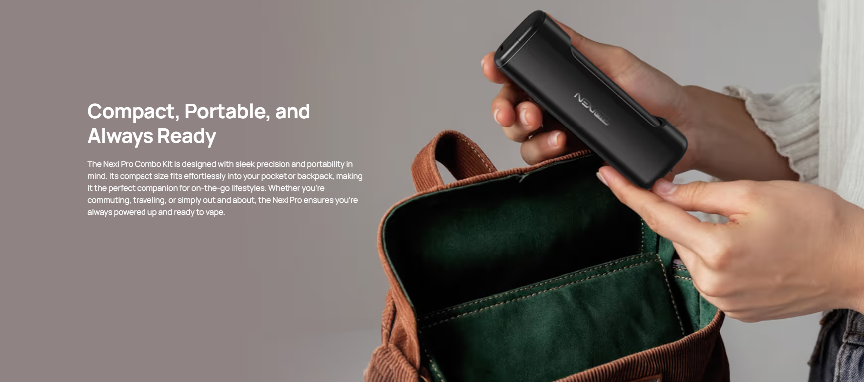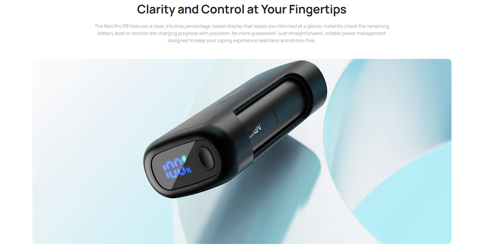 Coté mensurations, comptez une hauteur de 103,8 mm ; une largeur de 35,5 mm et une épaisseur de 22,5 mm pour un poids de 50g coté Power Bank. Comptez une hauteur de 76,5 mm ; une largeur de 16,9 mm et une épaisseur de 13,4 mm pour un poids de 25g coté Device. Comptez par conséquent un poids total (PB + Device) de 75g. Une fois en mains l’ensemble est léger et agréable, le Device est quant à lui particulièrement compact et du haut de ses 25 petits grammes, surprend par sa légèreté, tant et si bien que vous pouvez envisager de vapoter sans les mains, l’appareil à la bouche tenu avec les dents. Nous retrouvons donc ce côté cigalike mais un peu plus comme un cigare, ce qui n’est présentement pas gênant. La Nexi Pro est par conséquent un feeling polyvalent, on peu l’utiliser dans la Power Bank et laissant juste sortir l’embout buccal, vous pouvez vapoter en tenant le Device (la cigarette électronique seule) ou sans les mains, à vous de choisir en fonction de vos affinités ou de la situation, c’est plutôt pratique, peu d’appareils proposent autant.