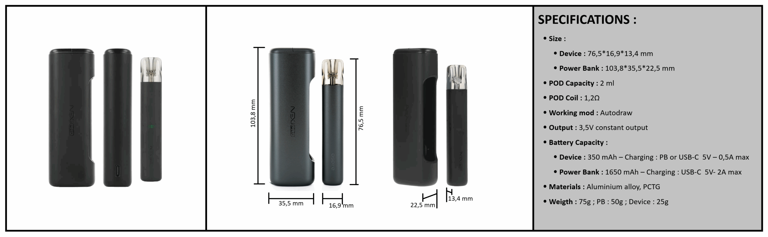 - Poids : 75g : PB 50g ; device e-cig 25g