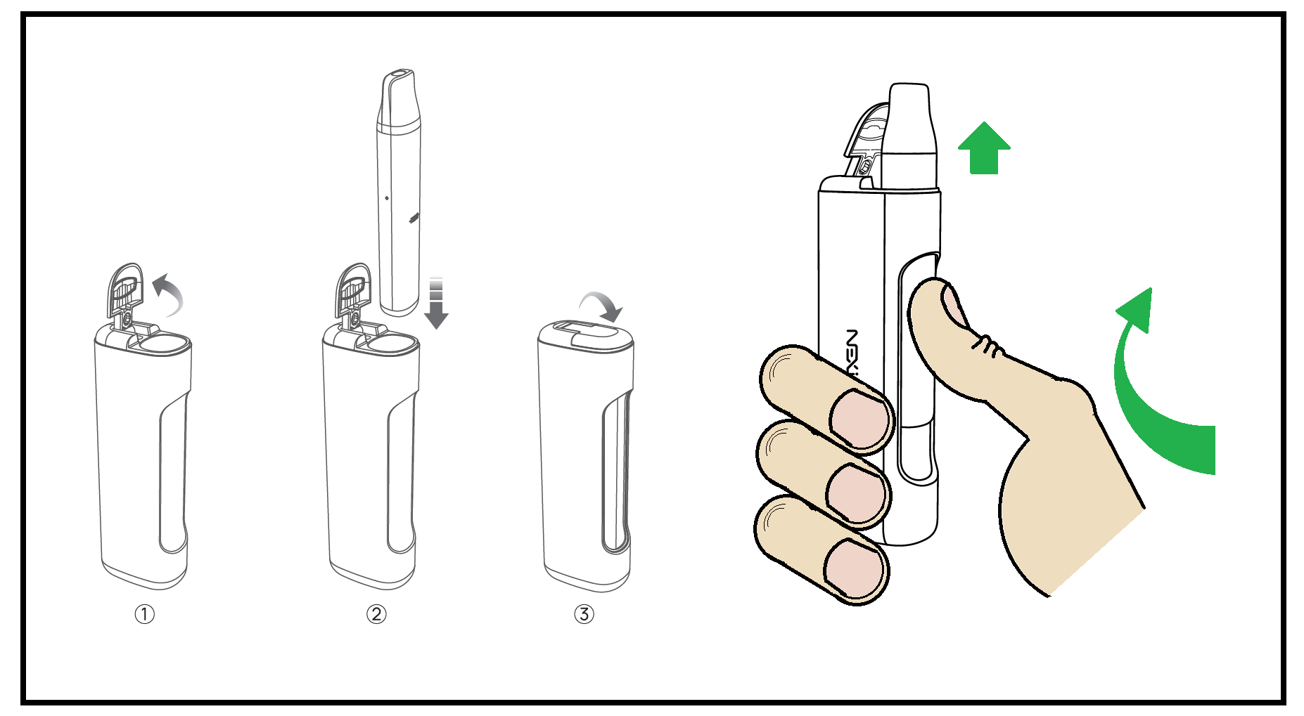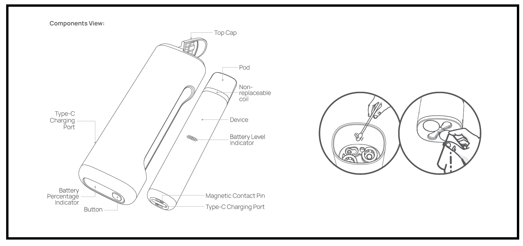 - Vapoter : Une fois avoir mis en place un POD rempli de e-liquide, aspirez simplement par l’embout buccal pour vapoter.