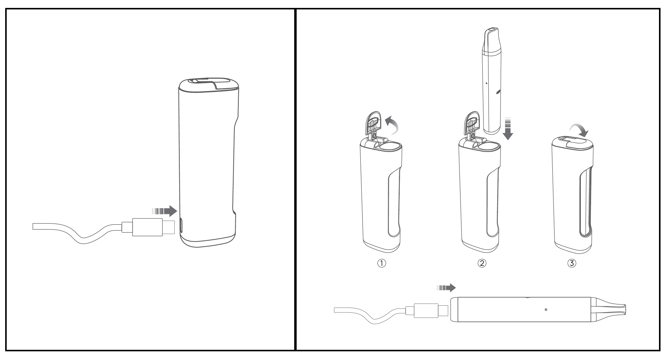 - Recharger l’appareil : Insérez simplement la cigarette dans la Power Bank chargée, le rechargement de la cigarette débutera instantanément et s’interrompra automatiquement une fois le dispositif à pleine charge. Vous pourrez en suivre la progression avec la couleur du voyant lumineux. Lorsque la charge est complété, le voyant lumineux clignotera 10 fois.