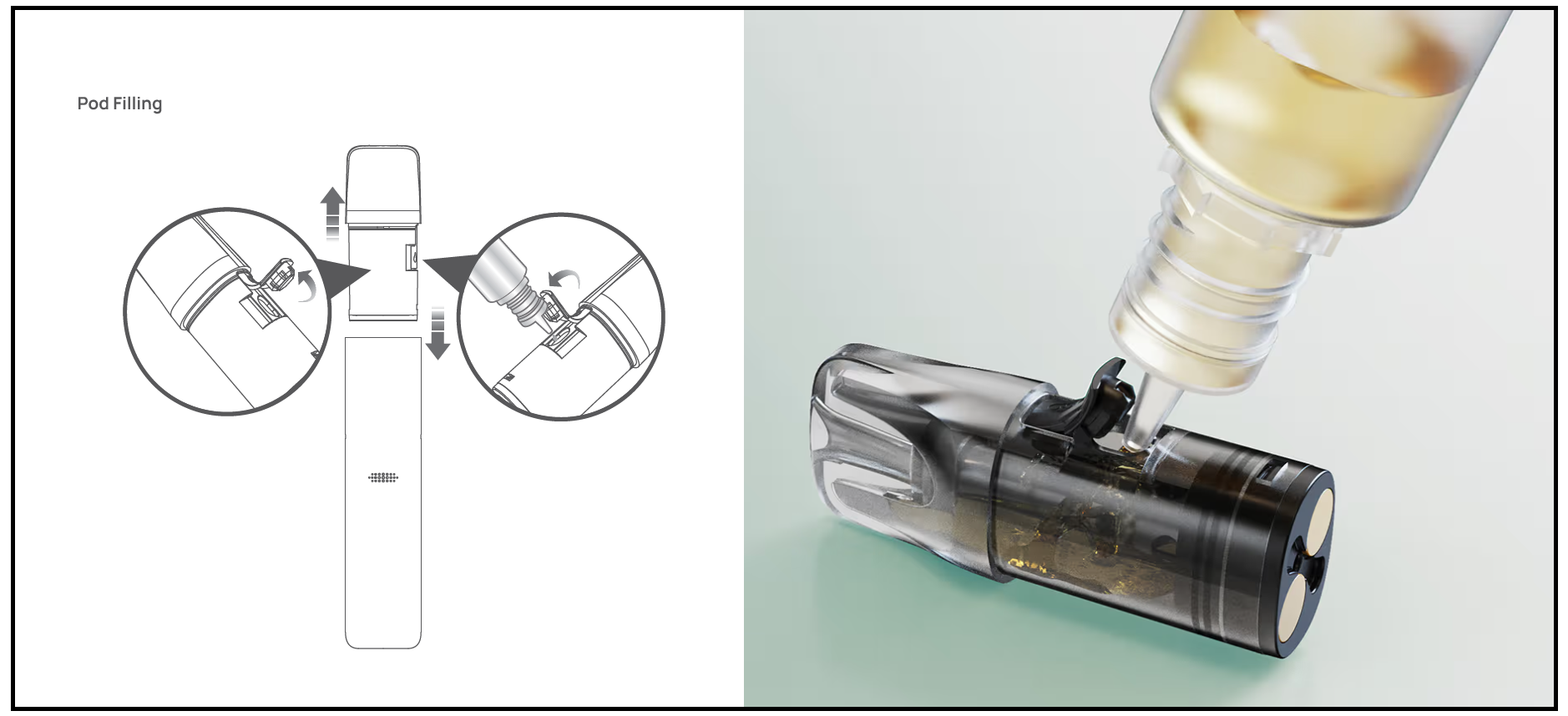 - 3 : Une fois le remplissage effectué, remettez en place le bouchon en veillant à bien le reboucher, remettez en place le pod dans la batterie. Dans le cas d’un premier remplissage sur un pod neuf, patientez 5 – 10 minute avant de vapoter pour vous assurer d’une bonne imbibition des cotons et éviter les risque de Dry-Hit. Dans le cas d’un simple remplissage sur un pod déjà en fonction, vous pouvez vapoter de nouveau sans nécessité d’attente.
