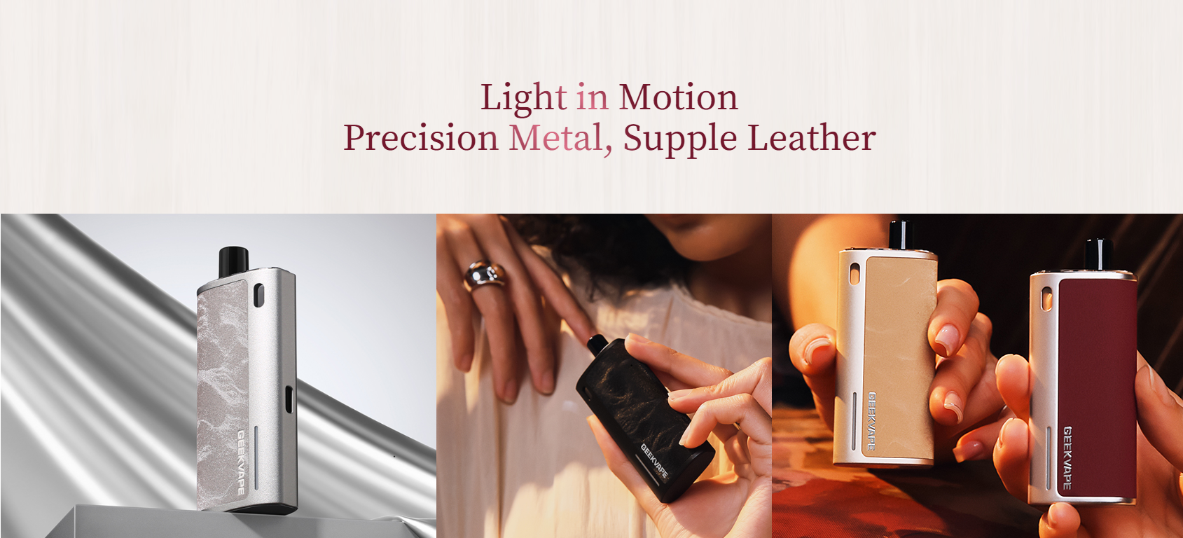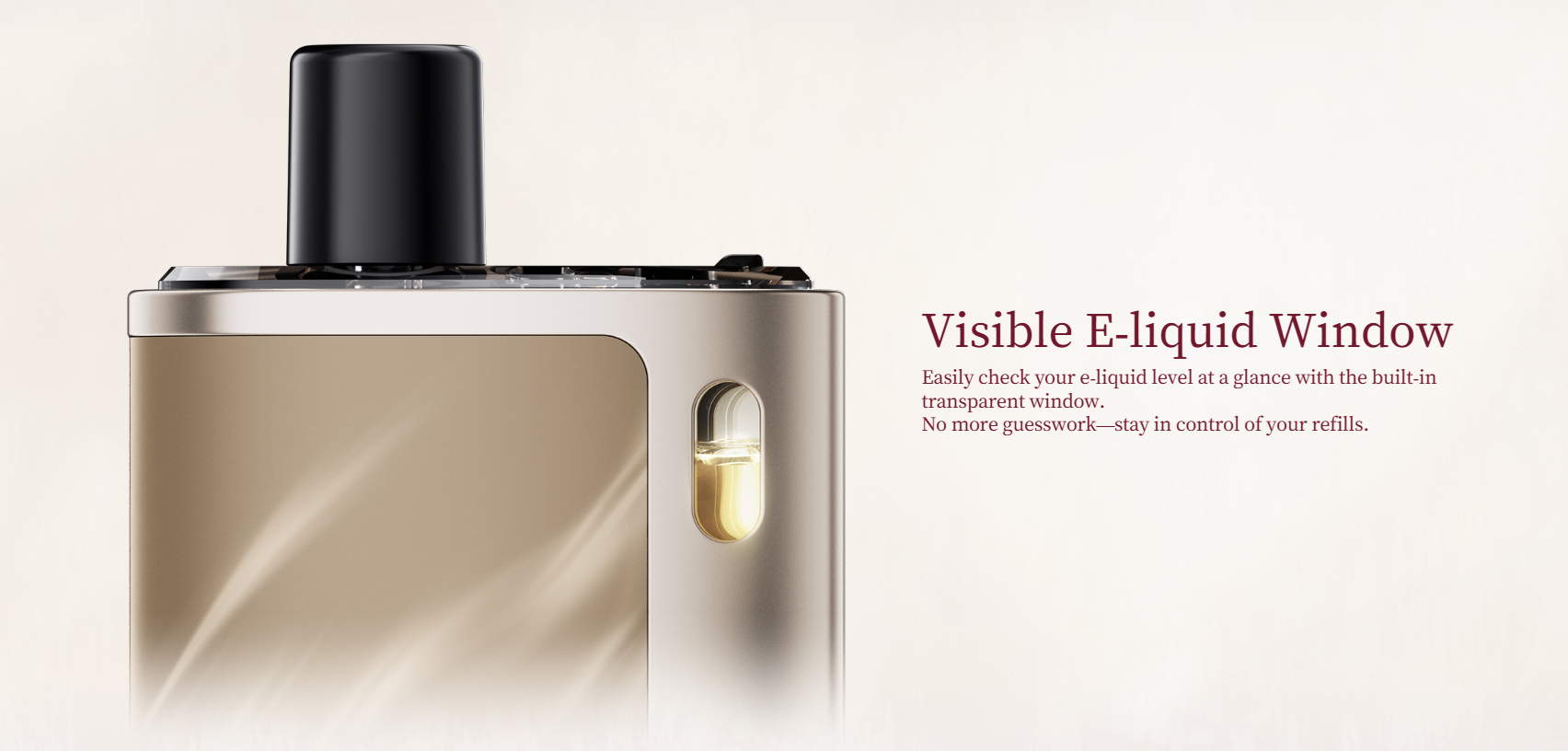 Commençons par le premier abord, l’aspect visuel. Très compact, sobre et élégant l’appareil offre un format rectangulaire, ergonomique tout en courbes. Le fabricant à ici fait le choix d’une coque en alliage de zinc, pour une bonne robustesse ainsi qu’un poids dense et confortable. Recouvert en majeur partie d’un grip en cuir végan, l’appareil visiblement très bien léché offre des finitions impeccables avec un effet bi-matière confortable et classieux. Nous relevons une interface minimaliste résumée à un voyant LED RGB pour le niveau de charge de la batterie, ainsi que deux fenêtres astucieusement placée de part et d’autre au sommet de l’appareil pour une bonne visibilité du niveau de e-liquide restant dans le réservoir. L’appareil annonce dès lors une utilisation des plus simple et pratique en autodraw, comme une PUFF.