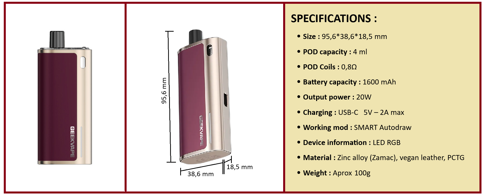 Coté mensurations, comptez une hauteur de 95,6 mm ; une largeur de 38,6 mm et une épaisseur de 18,5 mm pour un poids d’approximativement 100g. Une fois en mains, l’appareil très compact est très confortable tout en offrant une densité agréable. Ses dimensions réduites conviendront bien aux petites mains tout en étant appréciable pour les plus grandes. Une fois de plus Geekvape nous propose un appareil bien conçu, bien pensé, aussi agréable à l’œil que pratique à l’usage.