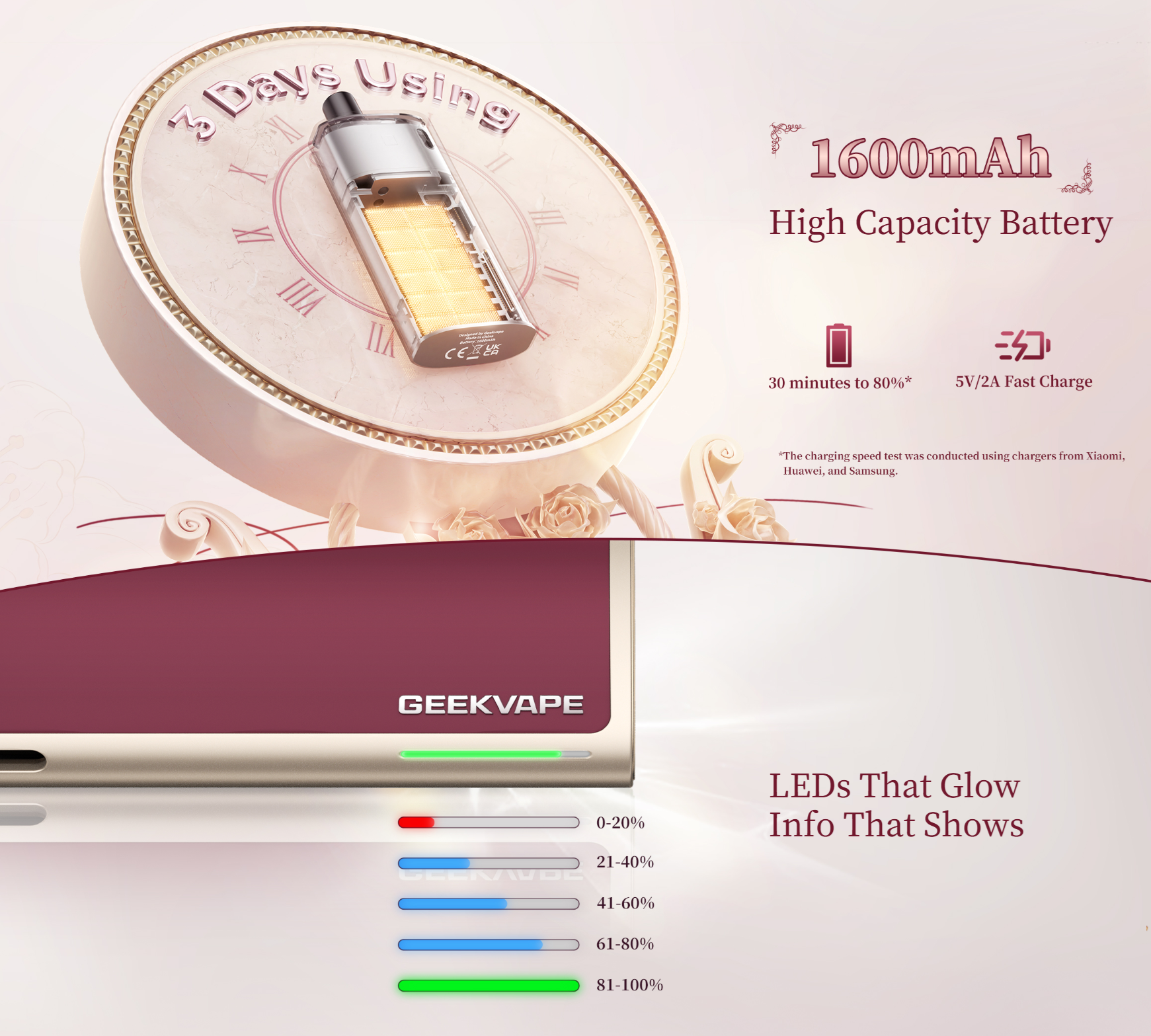 Entrons dans le vif du sujet avec la batterie intégrée et l’électronique de l’appareil. Geekvape à ici fait le choix d’une autonomie de 1600 mAh, une capacité plutôt confortable étant donné l’impédance unique de 0,8Ω proposé par les cartouches POD PEAK et leurs tirages serrés à restrictifs. Bénéficiant d’un format de poche taillé pour vous accompagner partout cette PEAK 2 peut donc sans problème ambitionner de vous offrir une journée complète de vapotage.