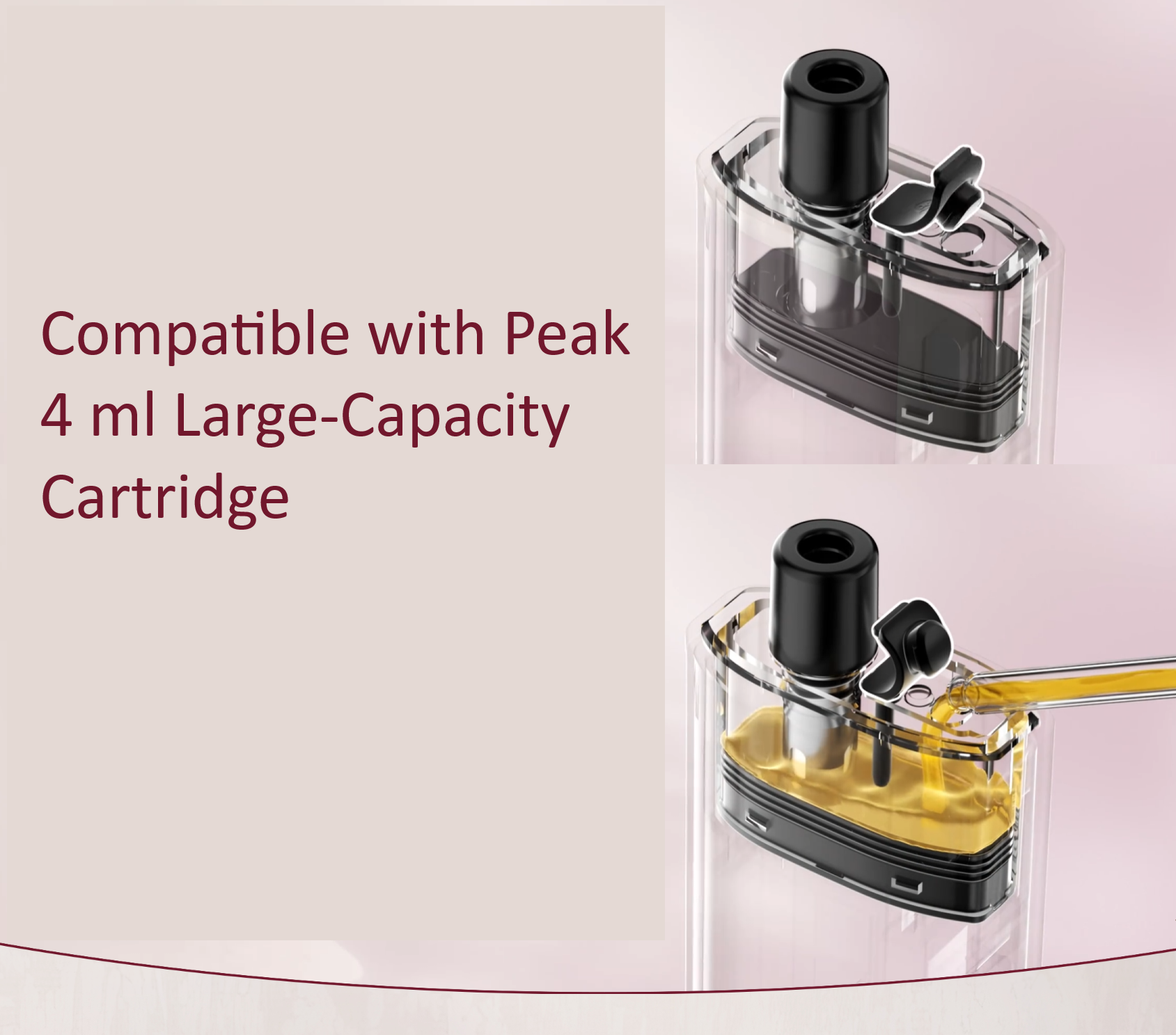 Composé majoritairement de PCTG, une plasturgie stable, translucide, résistante aux chocs et à la chaleur, les cartouches PEAK disposent d’un réservoir d’une capacité de 4 ml, d’un remplissage pratique par le haut (Top-Fill) ainsi que d’un Drip-Tip fix (non amovible) 510 ouvert cohérent avec les tirages proposés. Nous retrouvons en outre une conception antifuite avec une culasse faisant office de chambre à condensats ainsi qu’un encrage magnétique assuré par des aimants Néodymes puissant.