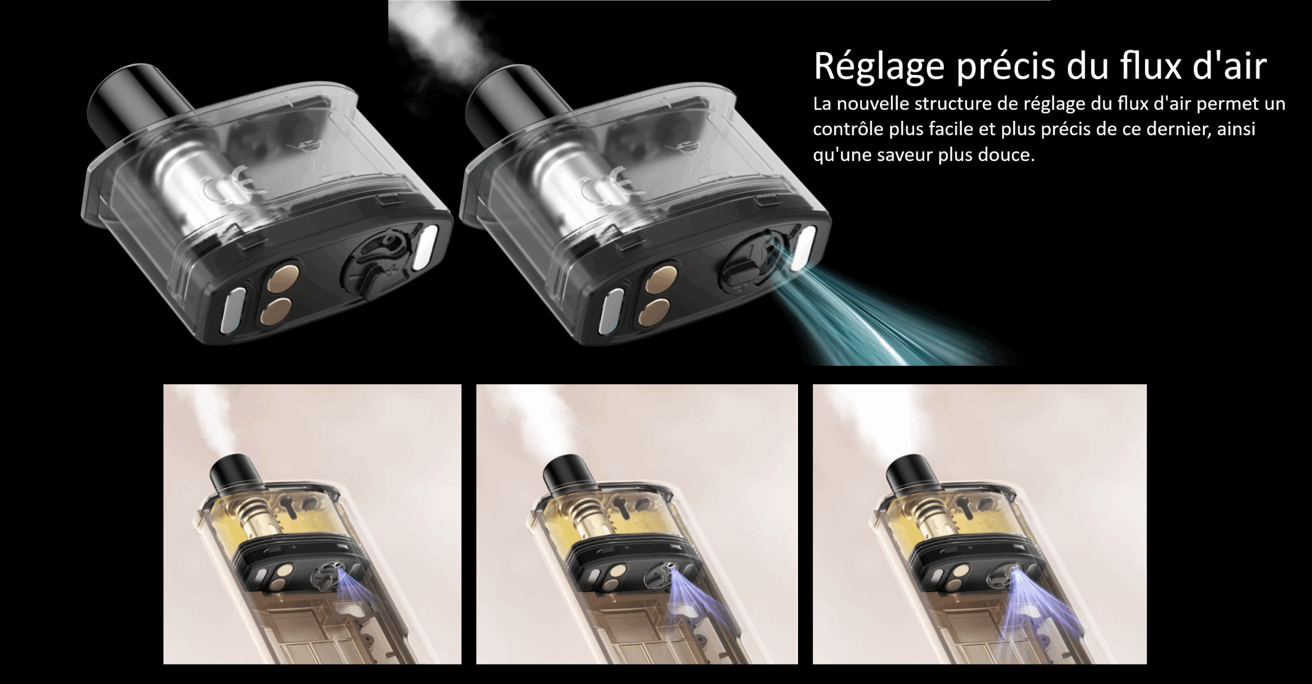 Petite particularité, le débit d’air (Airflow) est ici réglable sur la cartouche, via une molette ajourée permettant un réglage assez fin et précis pour un rendu à votre convenance. Placé sous la cartouche, a coté de la connectique, au niveau de l’encrage cette dernière sera protégée de tout déréglage involontaire.