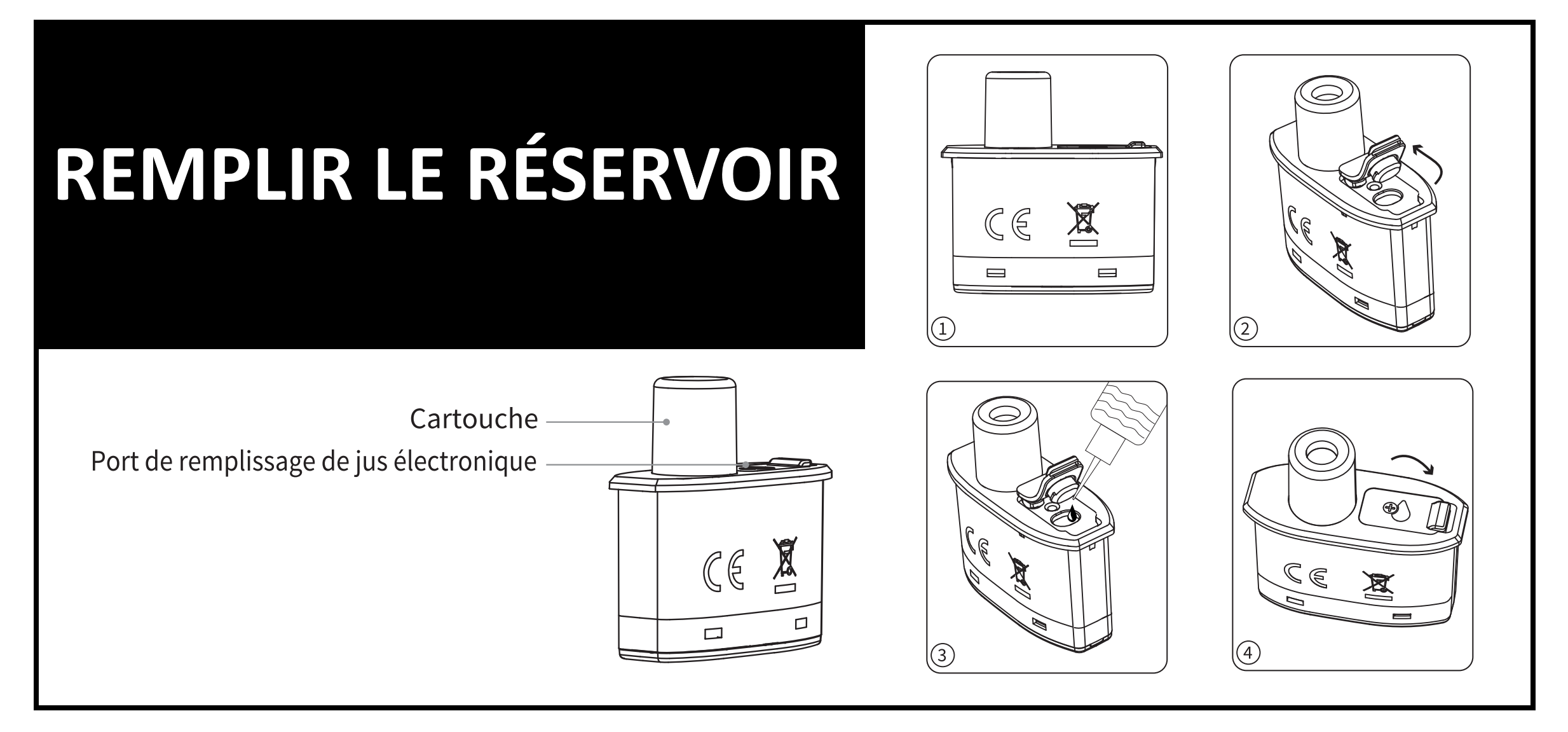 - 3 : rebouchez le réservoir, appuyez bien sur le bouchon en silicone pour vous assurer d’une bonne insertion et d’une bonne étanchéité du système. Dans le cas d’un premier remplissage sur une cartouche POD neuve, patientez une dizaine de minutes avant de vapoter pour vous assurer d’une bonne imbibition des cotons et éviter les risques de brûlure à sec (Dry-Hit). Dans le cas d’un simple remplissage sur une cartouche POD déjà en fonction, vous pouvez vapoter de nouveau sans nécessité d’attente.