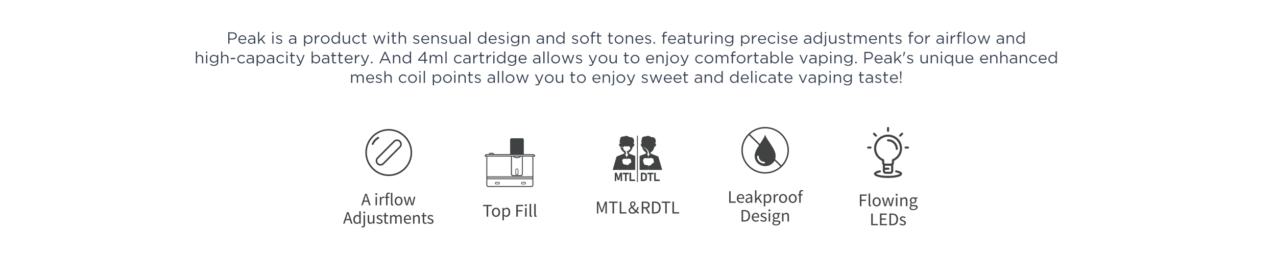 - Vapoter : Mettez en place une cartouche POD PEAK remplie de e-liquide dans l’appareil et aspirez simplement par l’embout buccal pour vapoter.